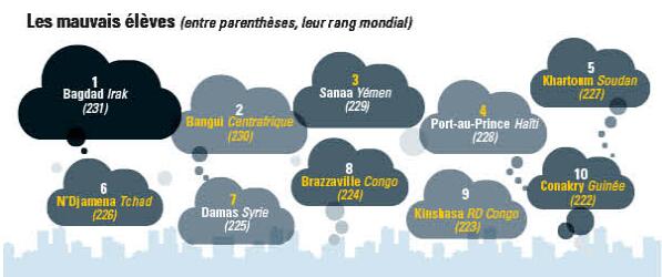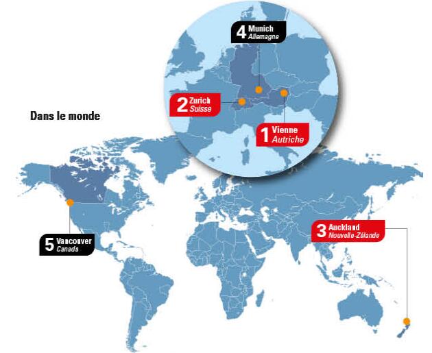 Le cabinet de conseil américain Mercer a dévoilé, le 14 mars, son classement annuel des villes qui offrent la meilleure qualité de vie dans le monde. Les 231 villes citées sont rangées selon des critères aussi divers que la sécurité, l’éducation, les infrastructures, la santé publique ou encore la culture. La grande gagnante étant Vienne, en Autriche, et la dernière du tableau, Bagdad, en Irak, juste après Conakry, en Guinée.